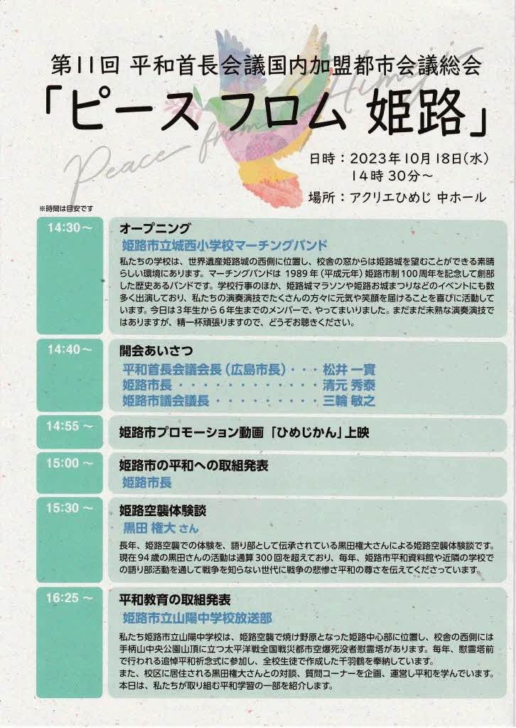 黒田権大さんは今年94歳。これまで兵庫県内の小中学校で3百数十回もの戦争の語り部をしてきました。2023年10月18~19日の両日、姫路市で、兵庫県として初めて平和首長会議国内加盟都市会議総会が開催されました(主催平和首長会議、広島市、長崎市)。黒田さんはこの会議のイベントの一つとしてご自身の姫路空襲体験談を40分にわたり語られました。命ある限り語り部を続けていく、との決意を表明して語りを締めくくられました。
